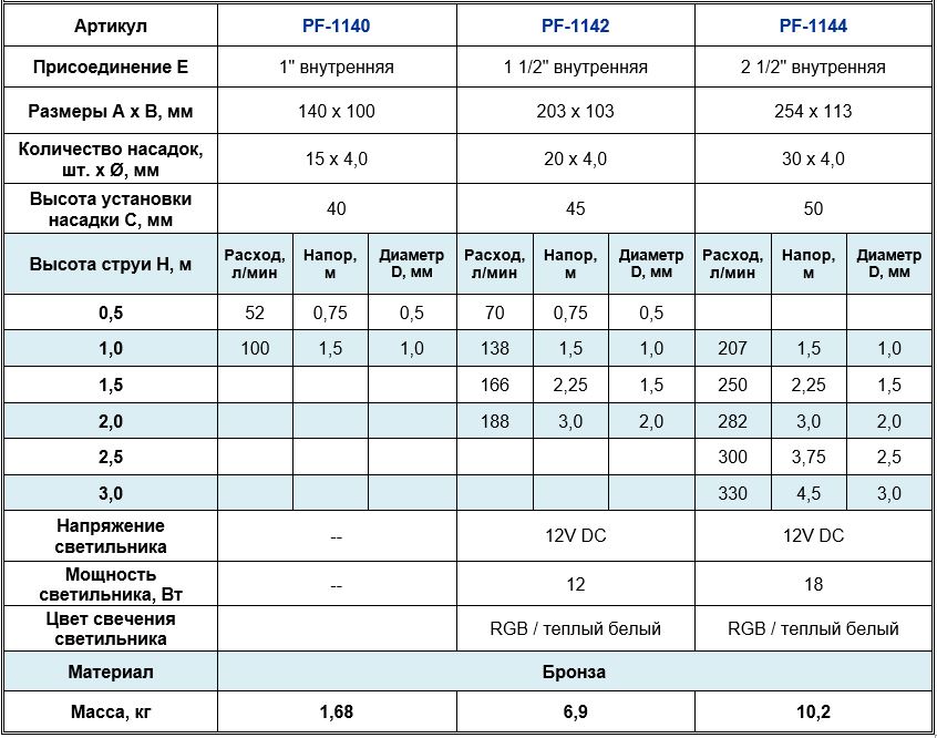 Модели PF-1142 и PF-1144 оснащены встроенным светодиодным прожектором (RGB или теплый белый свет), который эффектно подсвечивает водную картину в ночное время.