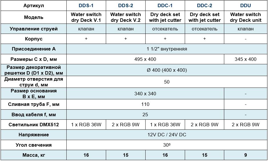 Комплект модуля включает корпус из полиэтилена, отсекатель струи, декоративную решетку из нержавеющей стали, насадку, систему RGB-подсветки и монтажный комплект.